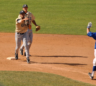 Then it was back to Goleta with visions of a sweep dancing in our heads. Davis got in a hole early going down 8-0, but came roaring back in dramatic fashion to score 8 unanswered runs. 2 of these runs came in the 8th and 4 in the 9th taking the game to extras. Davis plated another run in the top of the 10th to take the lead. In the bottom of the 10th with runners on the corners and 1 out, Lewis induced a slow ground ball up the middle that Scotty took himself for a game ending 4-3 double play giving Davis the extra innings win and series sweep.
